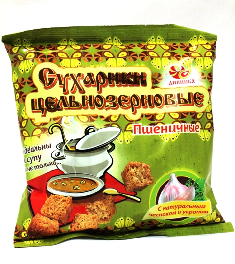 Сухарики цельнозерновые пшеничные с чесноком и укропом ТМ "Дивинка" изготавливается из Алтайской цельнозерновой муки, произведённой на деревенской мельнице по старинной технологии - без отделения зародыша зерна от оболочки и без использования улучшителей.